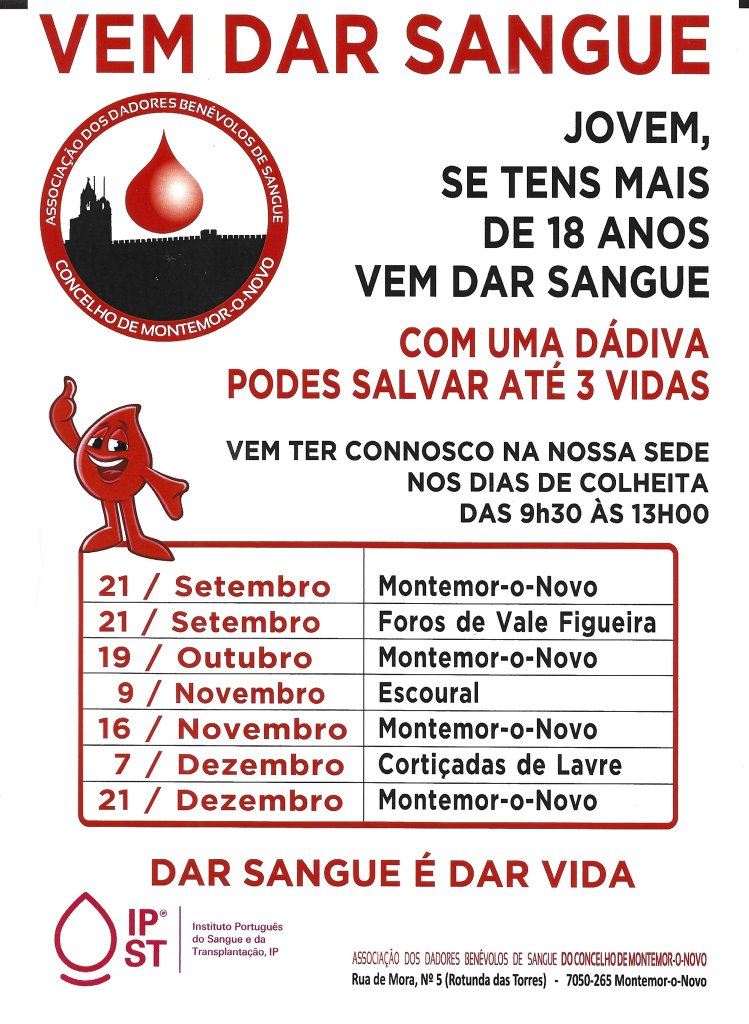 Todos os anos a Associação de Dadores Benévolos de Montemor-o-Novo, organiza uma dádiva de sangue na escola secundária de Montemor-o-Novo. “É organizado pelos estudantes, de Biologia e de Saúde, com o objetivo de cativar os jovens maiores de idade a iniciarem as suas dádivas. Este ano realiza-se no próximo mês de maio”, rematou Paulo Jesus.