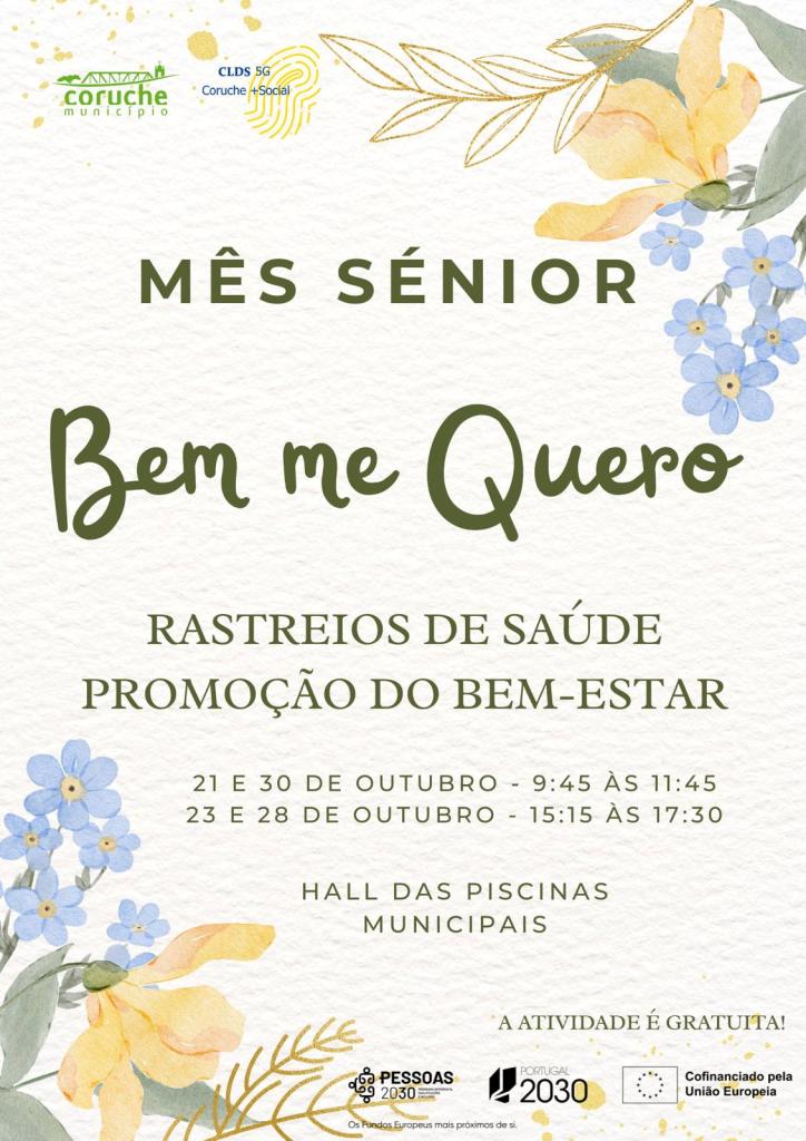 No âmbito das comemorações do Mês Sénior, o Contrato Local de Desenvolvimento Social de 5ª Geração – Coruche + Social (CLDS 5G) está a dinamizar a atividade “Bem me Quero”, que decorre até dia 30 de outubro, dirigida aos idosos residentes no Concelho.