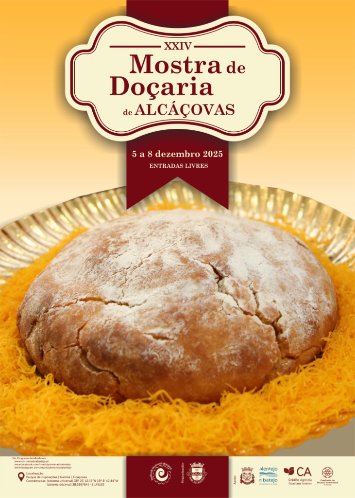 A partir de 5 de dezembro, começa em Alcáçovas, mais uma edição da Mostra de Doçaria, com a participação de doceiras e doceiros de vários pontos do país, numa iniciativa organizada pelo Município de Viana do Alentejo com o apoio da Junta de Freguesia de Alcáçovas, da Caixa de Crédito Agrícola, da Confraria dos Doces Conventuais do Alentejo e da Entidade Regional de Turismo do Alentejo e Ribatejo.