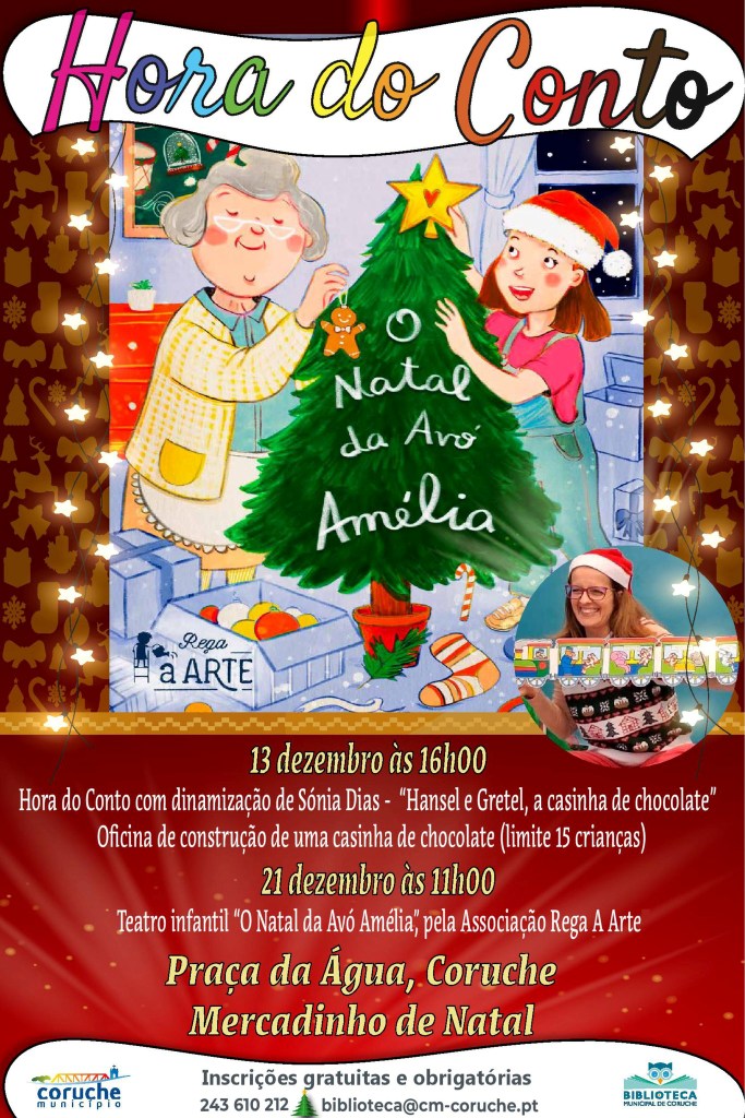 A Biblioteca Municipal de Coruche promove este mês duas iniciativas natalícias especiais dedicadas às famílias e às crianças no Parque de Natal. A primeira sessão decorre no dia 13 de dezembro, às 16 horas, e traz uma animada Hora do Conto dinamizada por Sónia Dias, com o clássico “Hansel e Gretel, a Casinha de Chocolate”. Depois da leitura, as crianças são convidadas a pôr as mãos na massa numa oficina de construção de uma casinha de chocolate, atividade lúdica e doce que promete despertar imaginação e espírito natalício (limite de 15 participantes).
