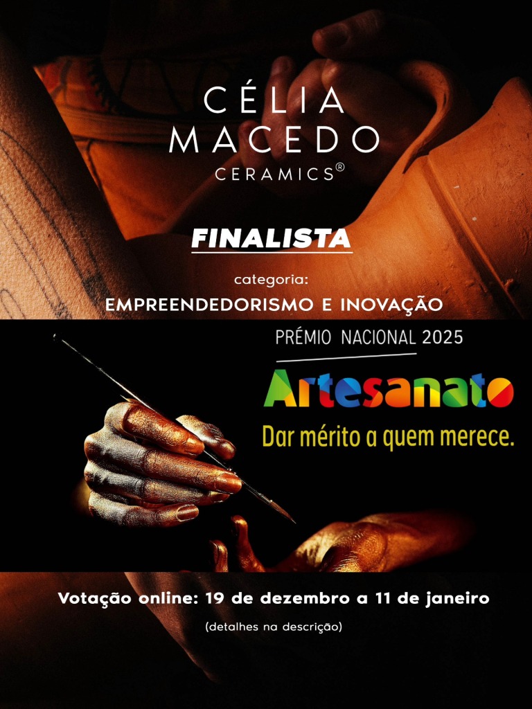 “A votação para o Prémio Nacional do Artesanato e todas as suas categorias é feita por um júri que contribui com cinco votos no total. Um desses votos é feito através da votação online, que está a decorrer na plataforma do IEFP- Instituto do Emprego e Formação Profissional e está aberta até dia 11 de janeiro. Eu tenho o link para a votação nas minhas redes sociais, Celia Macedo Ceramics, mas se forem ao site do IEFP também vão encontrar a ligação para o formulário da votação”, acrescentou.