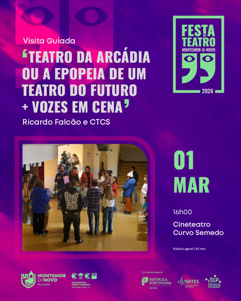 O Cineteatro Curvo Semedo, em Montemor-o-Novo, recebe no próximo dia 1 de março, pelas 16h00, uma visita guiada integrada na programação da Festa do Teatro 2026. A iniciativa, intitulada “Teatro da Arcádia ou a Epopeia de um Teatro do Futuro + Vozes em Cena”, convida a comunidade a descobrir os bastidores e a história daquele espaço cultural de referência.