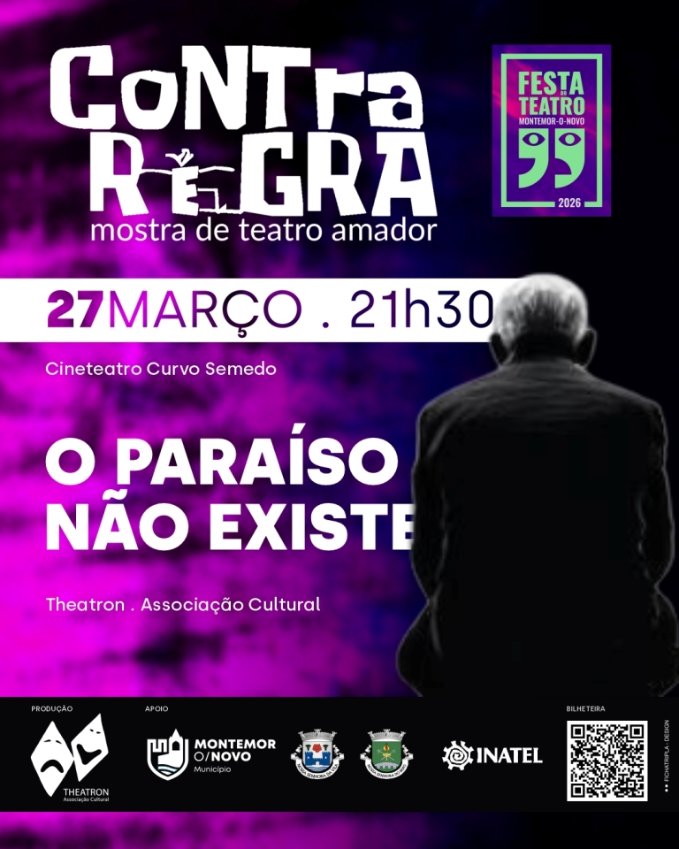 O espetáculo O Paraíso Não Existe, apresentado pela Theatron – Associação Cultural, estreia no próximo dia 27 de março de 2026, pelas 21h30, no Cineteatro Curvo Semedo, no âmbito da Festa do Teatro 2026 e do Festival Contra Regra – Mostra de Teatro Amador.