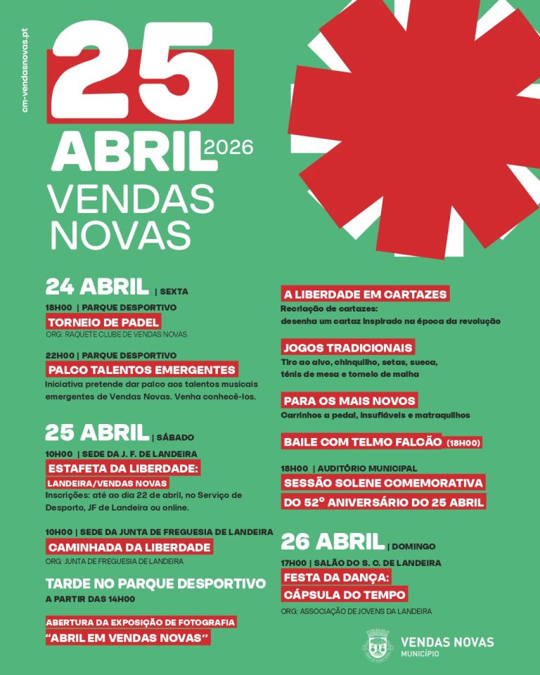 No dia 25 de abril, sábado, as celebrações arrancam às 10h00 com a Estafeta da Liberdade, entre Landeira e Vendas Novas, e com a Caminhada da Liberdade, promovida pela Junta de Freguesia de Landeira. Durante a tarde, a partir das 14h00, o Parque Desportivo acolhe diversas atividades, incluindo a abertura da exposição de fotografia “Abril em Vendas Novas”.