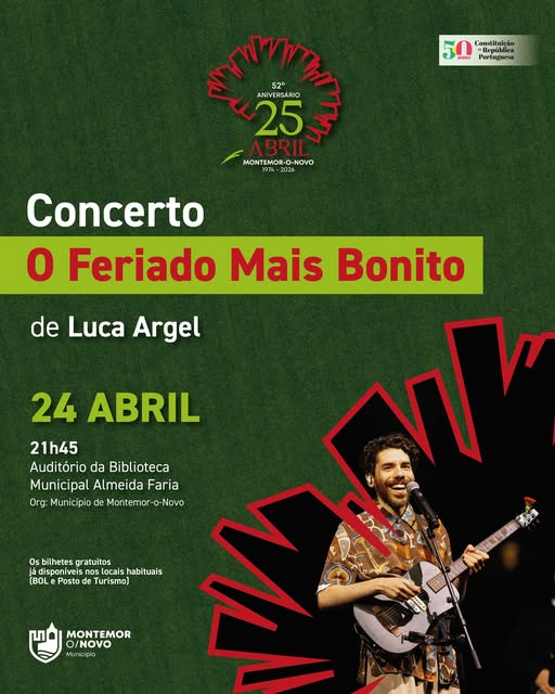 O Município de Montemor-o-Novo promove, no próximo dia 24 de abril, um concerto especial integrado nas comemorações do 25 de Abril. O espetáculo, intitulado O Feriado Mais Bonito, será apresentado pelo cantor e compositor Luca Argel e terá lugar no Auditório da Biblioteca Municipal Almeida Faria, com início marcado para as 21h45.